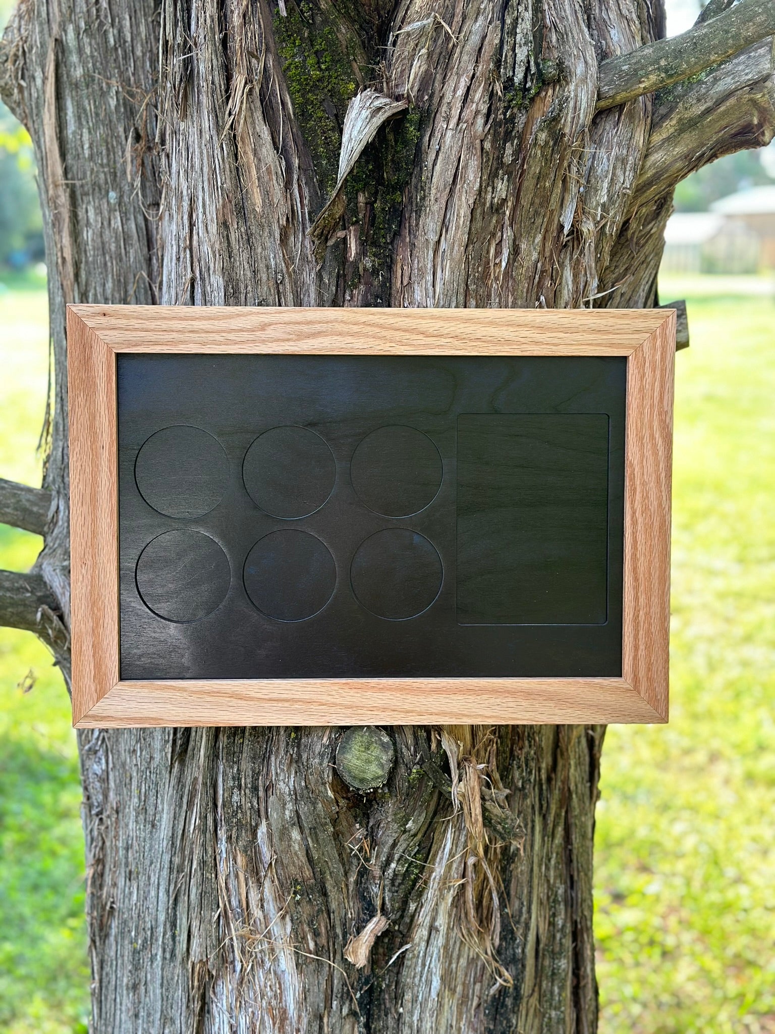 11x17 version featuring a cut out for a 5x7 photograph and up to 6 3" Medals. The frame will come setup to be displayed Landscape, if you need Portrait orientation please contact me.