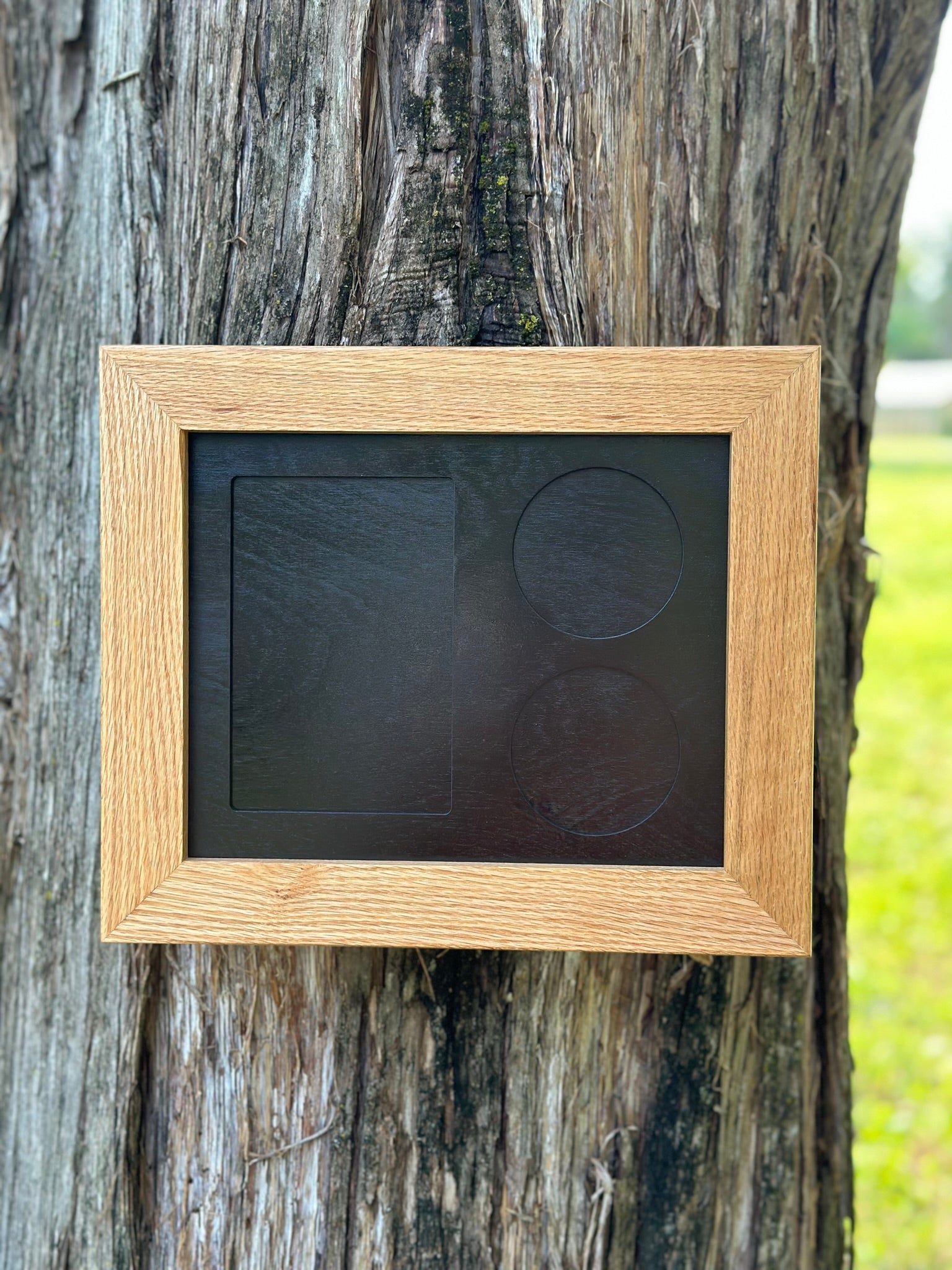 Comes ready to hang on the wall with a saw tooth hanger. Frame is Handmade from Solid Red Oak and finished with Furniture Grade Lacquer.