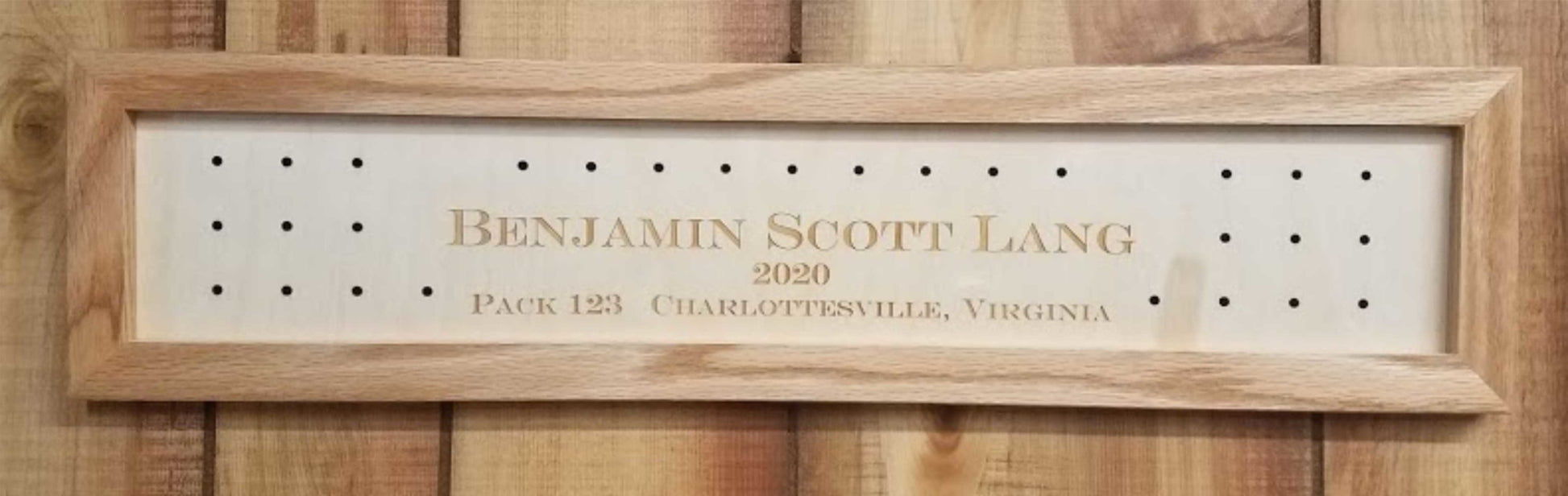 Our Adventure Pin Frame is highly customizable to fit your specific needs. You can choose the precise number of holes to perfectly match the number of Adventure Pins your Scout has earned, making the frame as unique as their individual journey. Additionally, the frame features three lines of custom engraving where you can add personalized messages, names, or dates, providing that extra special touch. Whether you include the Scout's name, pack