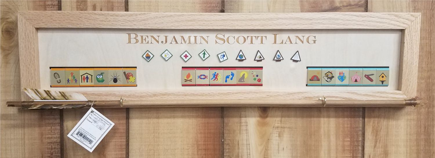 Introducing our exquisitely handcrafted Belt Loop and Pin Frame, a perfect way to display a Scout's accomplishments and milestones with pride and elegance. Measuring 24" long and 5.75" wide, this customized plaque is meticulously crafted from high-quality birch, ensuring durability and timeless appeal. The natural oak frame is an excellent canvas to celebrate each level of Scouting advancement, with dedicated slots for the required belt loops and holes for the adventure pins. Additionally, it features brass-plated hooks to beautifully mount a Navajo Arrow, adding a unique and cultural touch to the display.