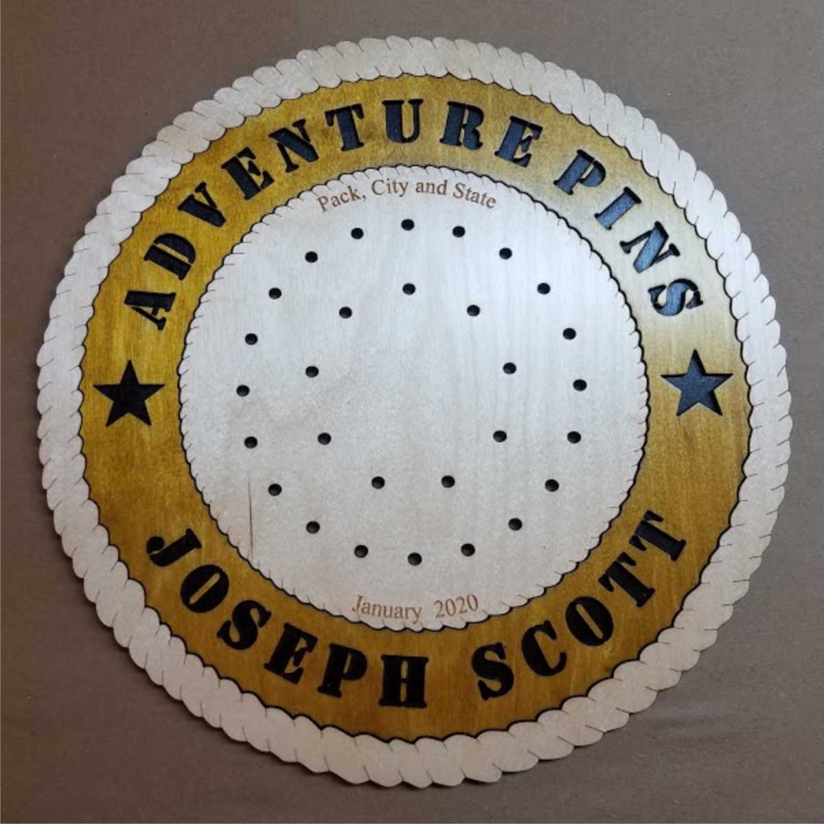 This Adventure Pin Display Plaque is not only functional but also a piece of art. The stained ring's finish enhances the beauty of any room, while four lines of custom engraving offer a personalized touch, adding a name, date, and location of the unit. Each plaque can be tailored specifically to your Scout's journey, ensuring that every adventure and accomplishment is proudly displayed.