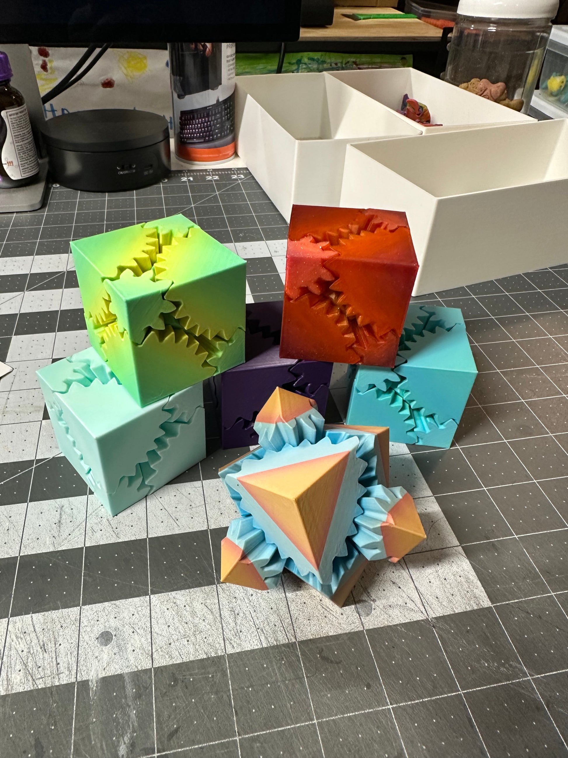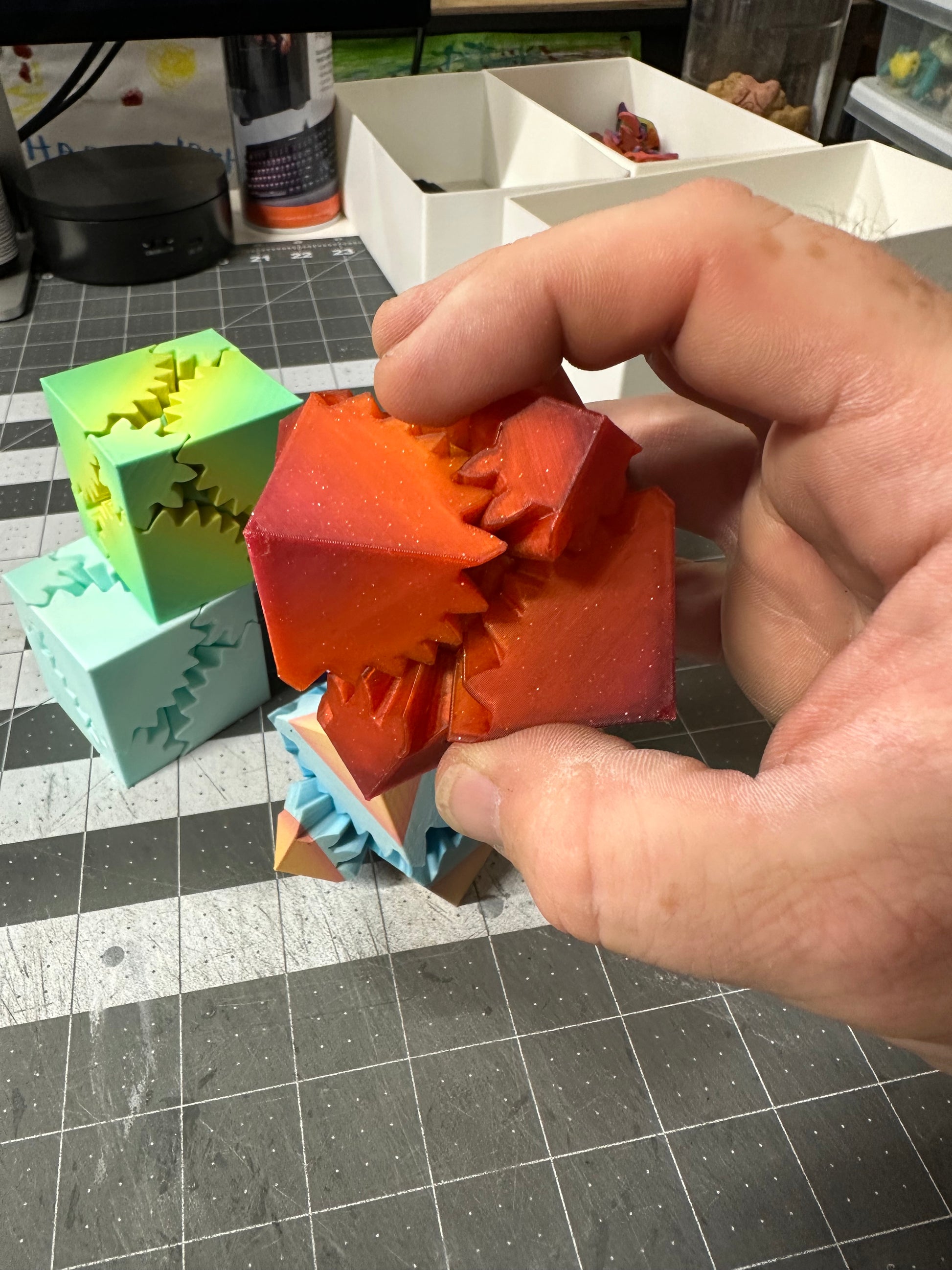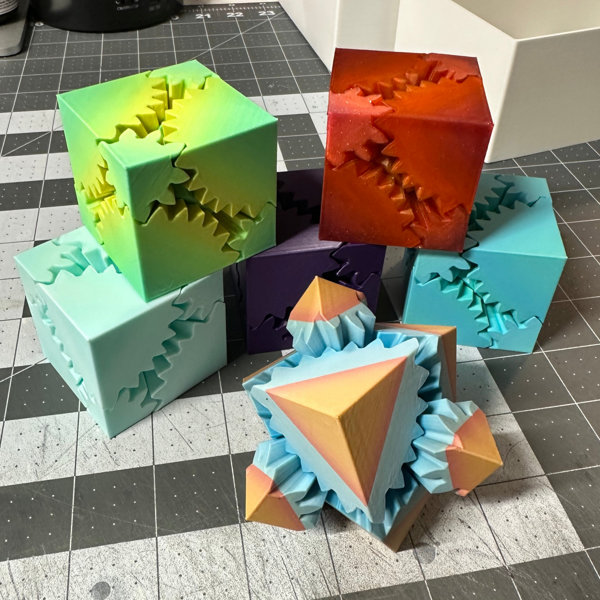 The Gear Cube is a playful desktop fidget toy, perfectly sized at 2" x 2" x 2" for endless twisting fun. 3D printed right in Troy, Virginia, this colorful cube comes in both vibrant multi-color and sleek single-color options. Keep your hands busy and your creativity flowing with this uniquely crafted stress-buster made in the USA!