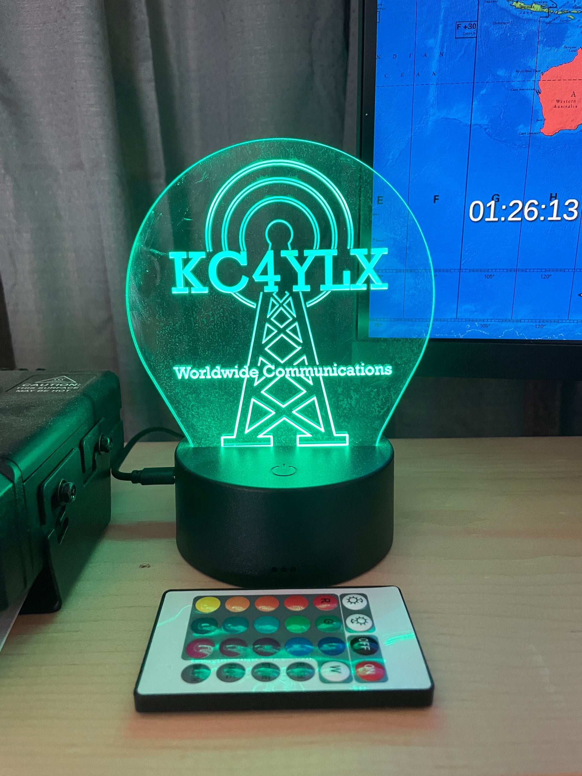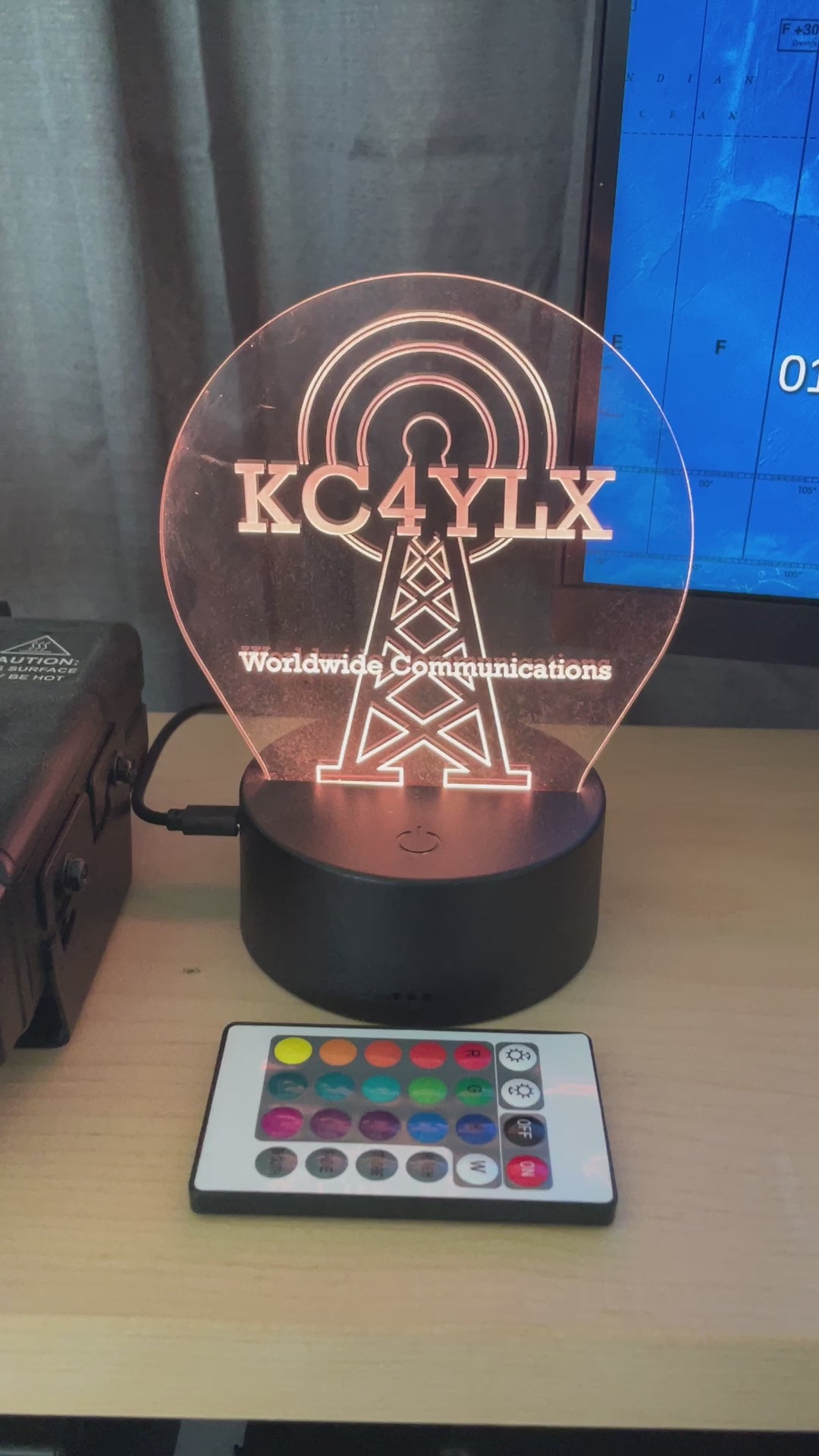 Brighten up your Ham Radio Station with our Custom Engraved LED Light Base! Tailored specifically to display your Ham Radio Call Sign, GMRS Call, or CB Handle, this piece transforms your space into a vibrant, personalized showcase. The stunning radio tower design engraved on high-quality acrylic catches the eye, while the RGB LED lights illuminate your call sign in an array of dazzling colors. Use the convenient remote to switch between colors and modes, and the USB power cord ensures seamless and efficient usage.